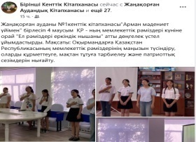 2025 жылдың 4 маусым күні №1 кенттік кітапхананың ұйымдастыруымен және «Арман мәдениет үйінің» қатысуымен «Ел рәміздері – еркіндік нышаны» атты дөңгелек үстел өтті. Мақсаты: Оқырмандарға Қазақстан Республикасының мемлекеттік рәміздерінің маңызын түсіндіру, оларды құрметтеуге, мақтан тұтуға тәрбиелеу және патриоттық сезімдерін нығайту.