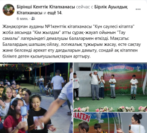 Жаңақорған ауданы №1 кенттік кітапханасы 13 тамыз күні  «Күн сәулесі кітапта» жобасы аясында «Тау самалы» жазғы лагерінде демалушы балалардың бос уақытын тиімді өткізу, танымдық белсенділіктерін арттыру мақсатында «Кім жылдам?» атты интеллектуалды сұрақ-жауап ойыны ұйымдастырылды.
